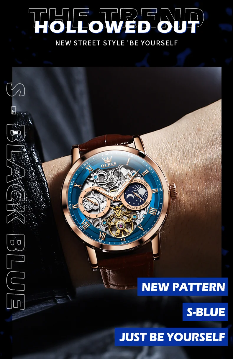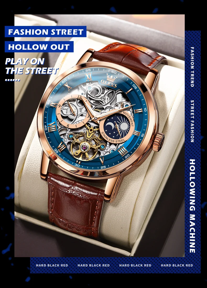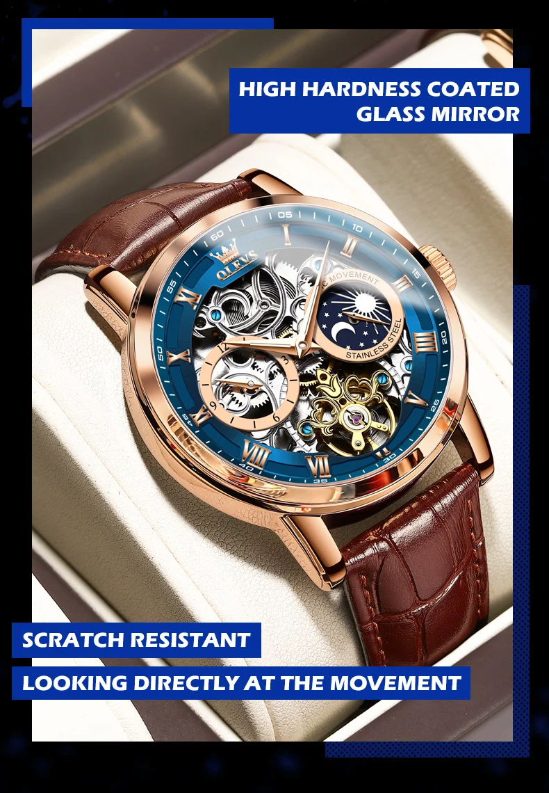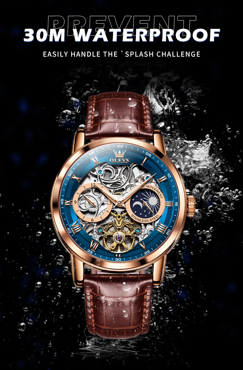Skeleton Mechanical Watch Waterproof Leather Strap Moon Phase Automatic Tourbillon Wristwatch